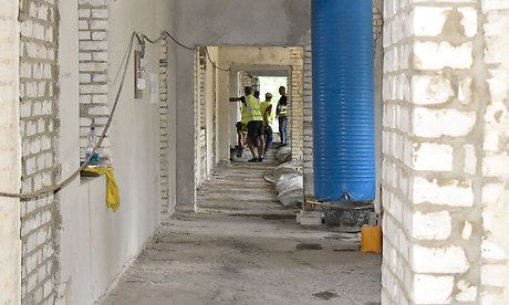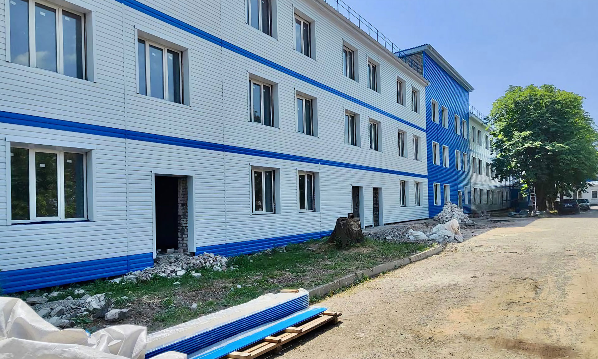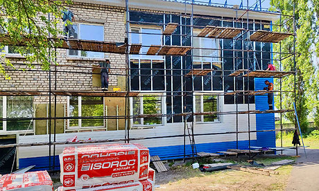 Инфекционная больница, которая не работала, это было разрушенное здание. Все, что здесь остается от прежнего здания,- это стены. Сейчас уже завершены работы по капитальному ремонту кровли над тремя зданиями: детских поликлиники и больницы, а также будущего инфекционного отделения. Также уже произведена замена оконных блоков и отделка откосов, продолжаются работы по монтажу вентилируемого фасада. В инфекционном отделении ведутся работы по заливке полов, приступили к монтажу перегородок.