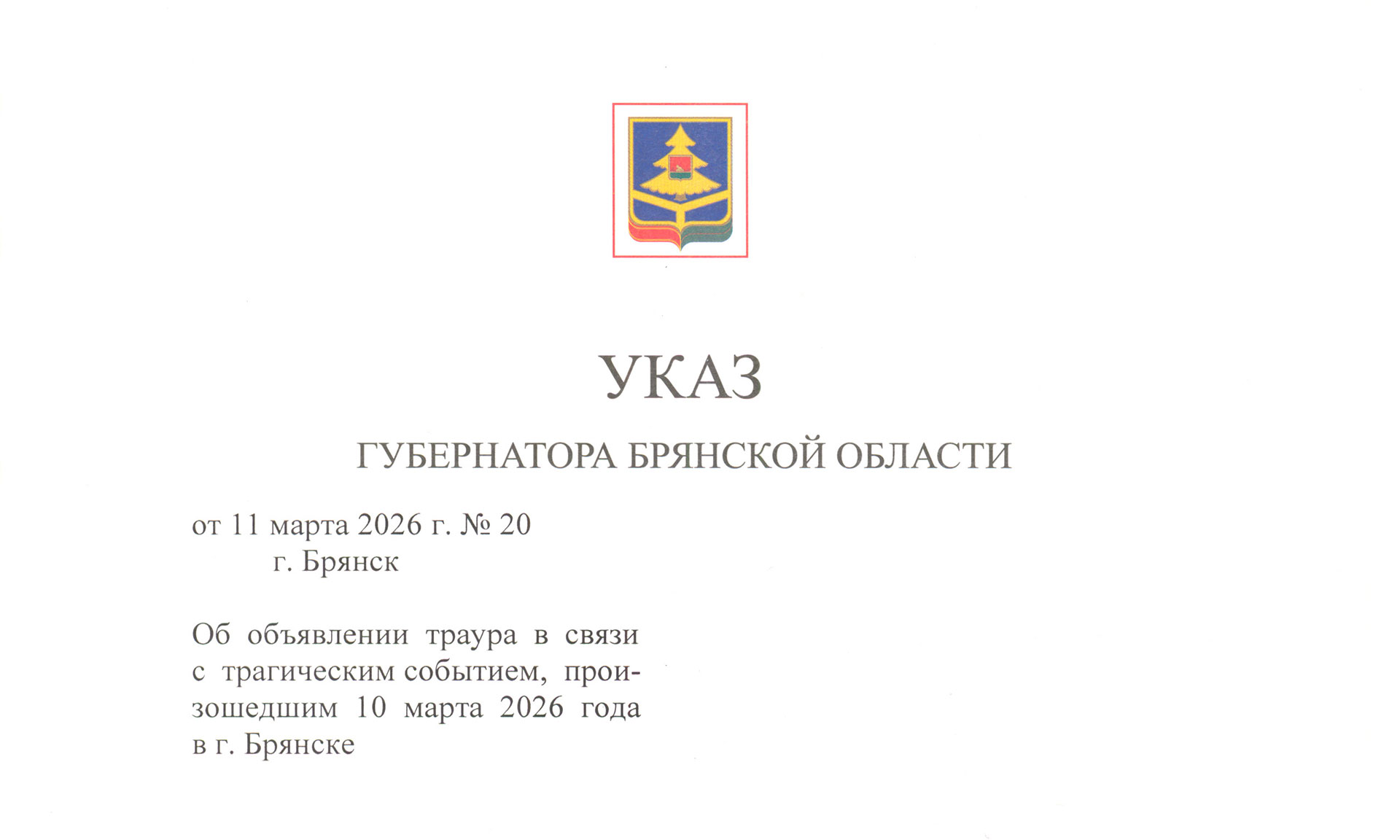11 марта 2026 года объявлено днем траура в Брянской области.